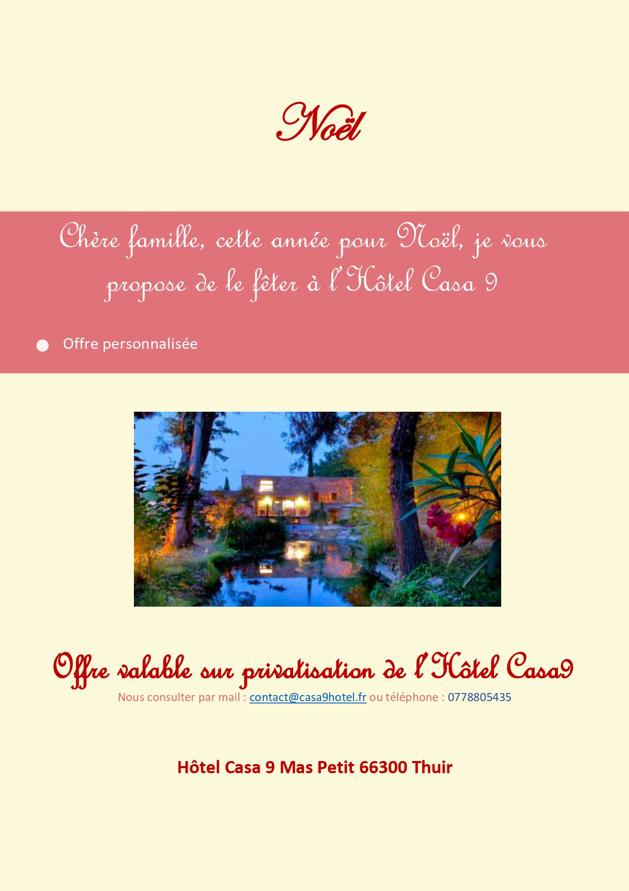 Durant la fermeture annuelle de l’hôtel Casa9 nous restons ouverts à toute demande de privatisation de l’établissement et ce, aux tarifs préférentiels hors saison :